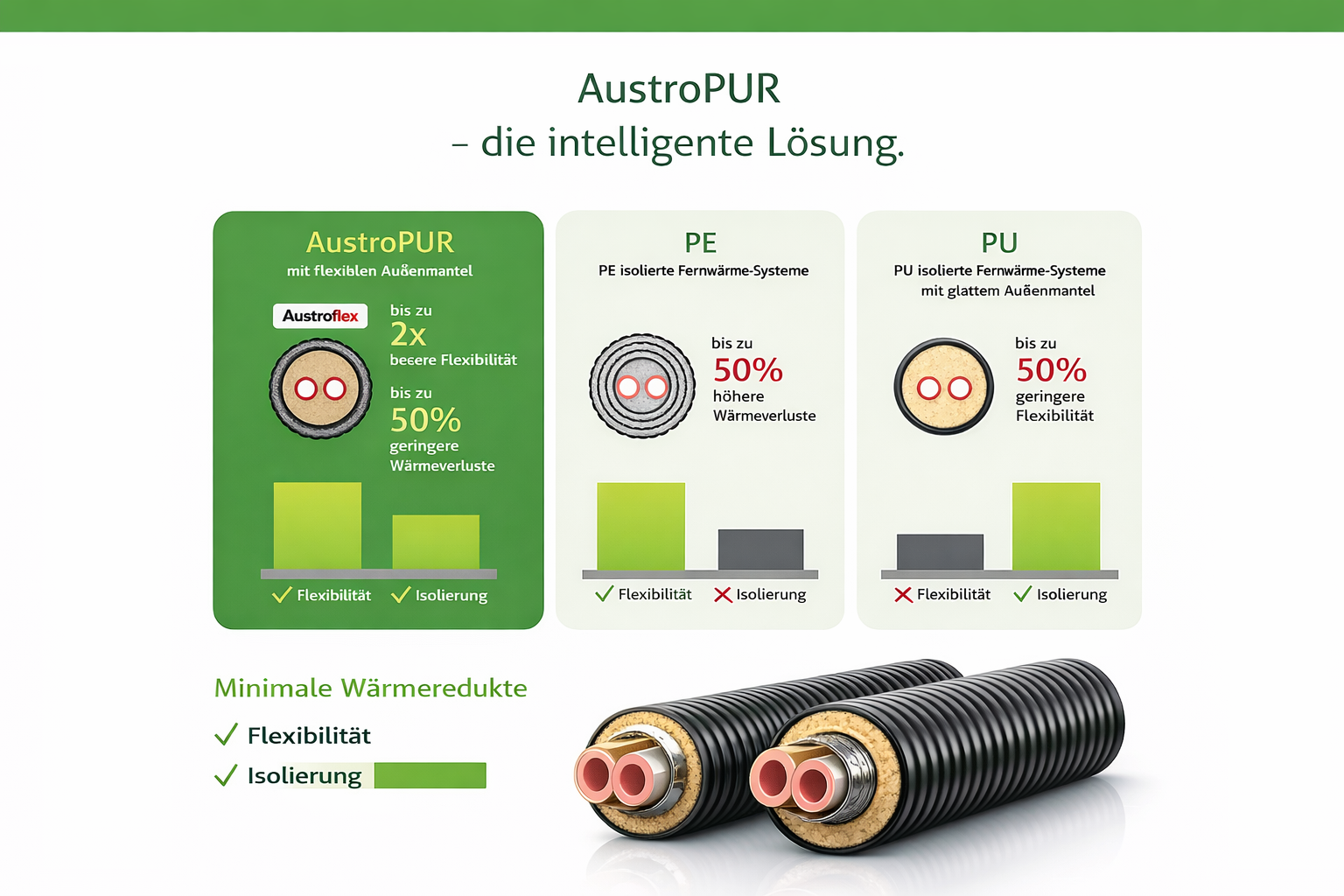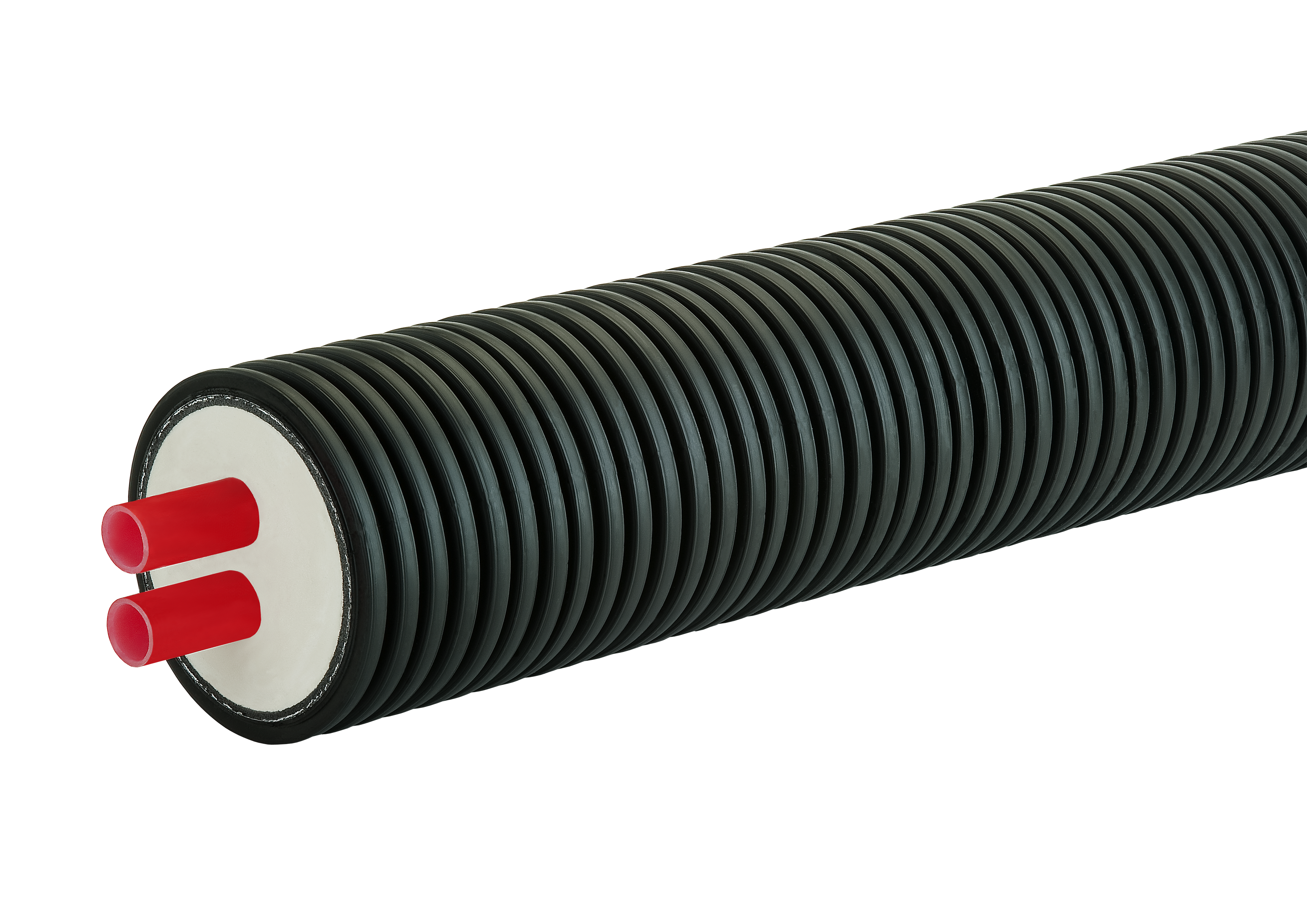Flexibles vorisoliertes und selbstkompensierendes Doppelrohr geeignet zur Hauptanwendung als Fernwärmeleitung für Zentralheizungsanlagen. Korrosionssicheres Mediumrohr aus vernetztem PE-Xa laut DIN