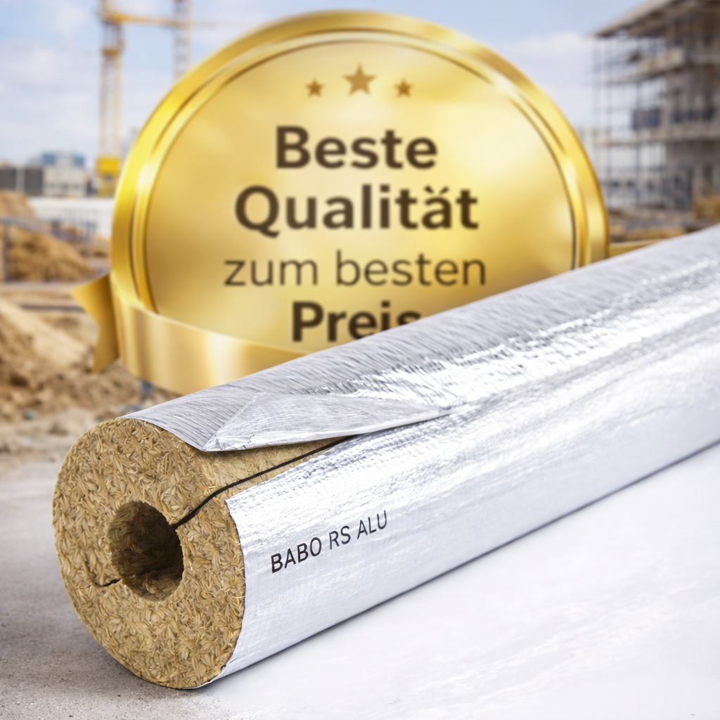 Maßgenau geschnittene Steinwolle - Rohrschalen, einseitig geschlitzt, kaschiert mit einer reißfesten Reinaluminiumfolie, in AS Qualität nach AGI Q135, stark wasserabweisend und geruchsneutral. Einfache Montage durch doppelseitiges Klebeband mit Fingerlift zum Verschließen der Rohrschale.