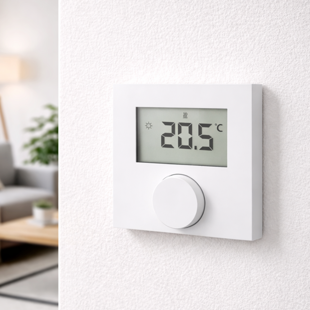 Digitaler Raumthermostat mit großer LCD Anzeige für Umschaltung Heizen/Kühlen.