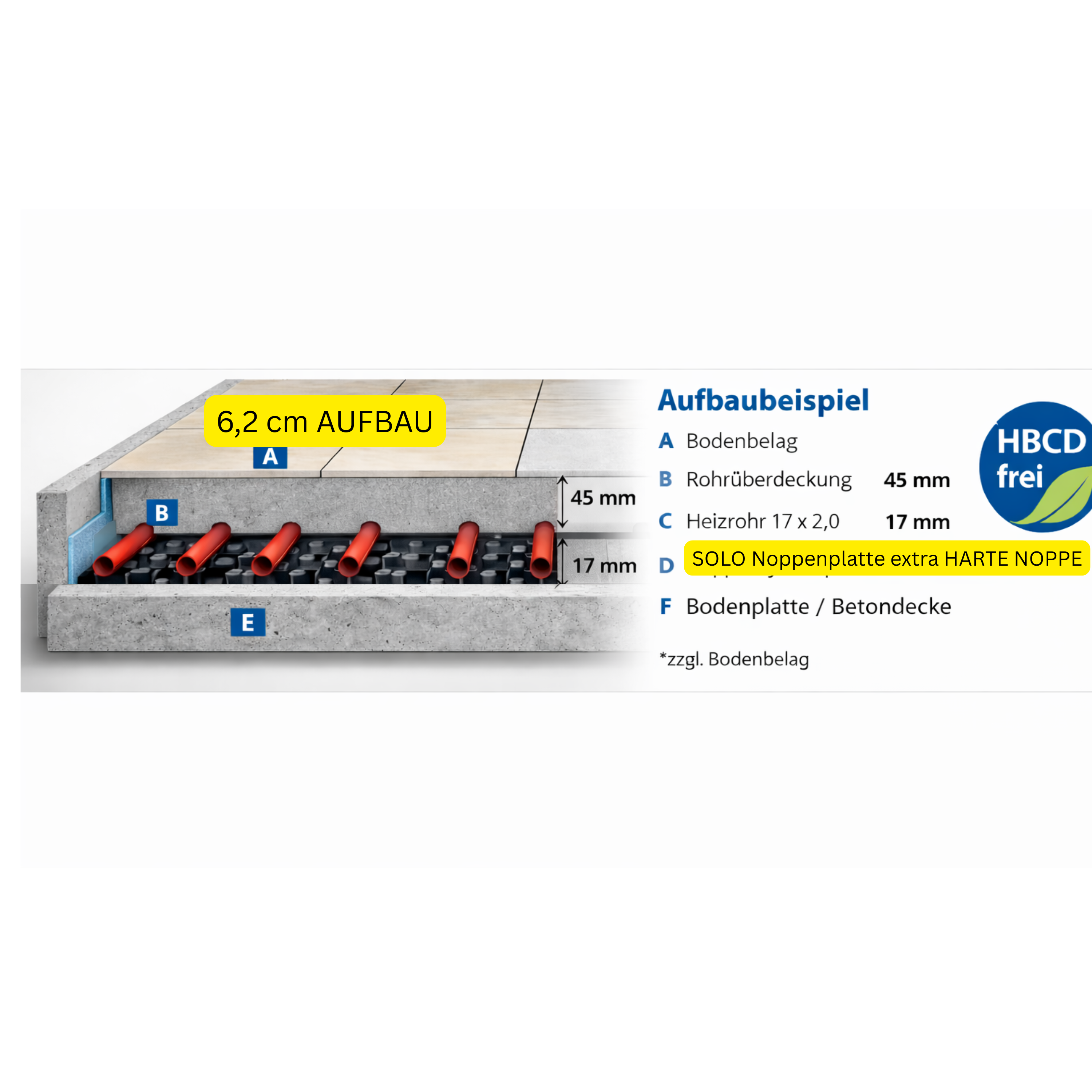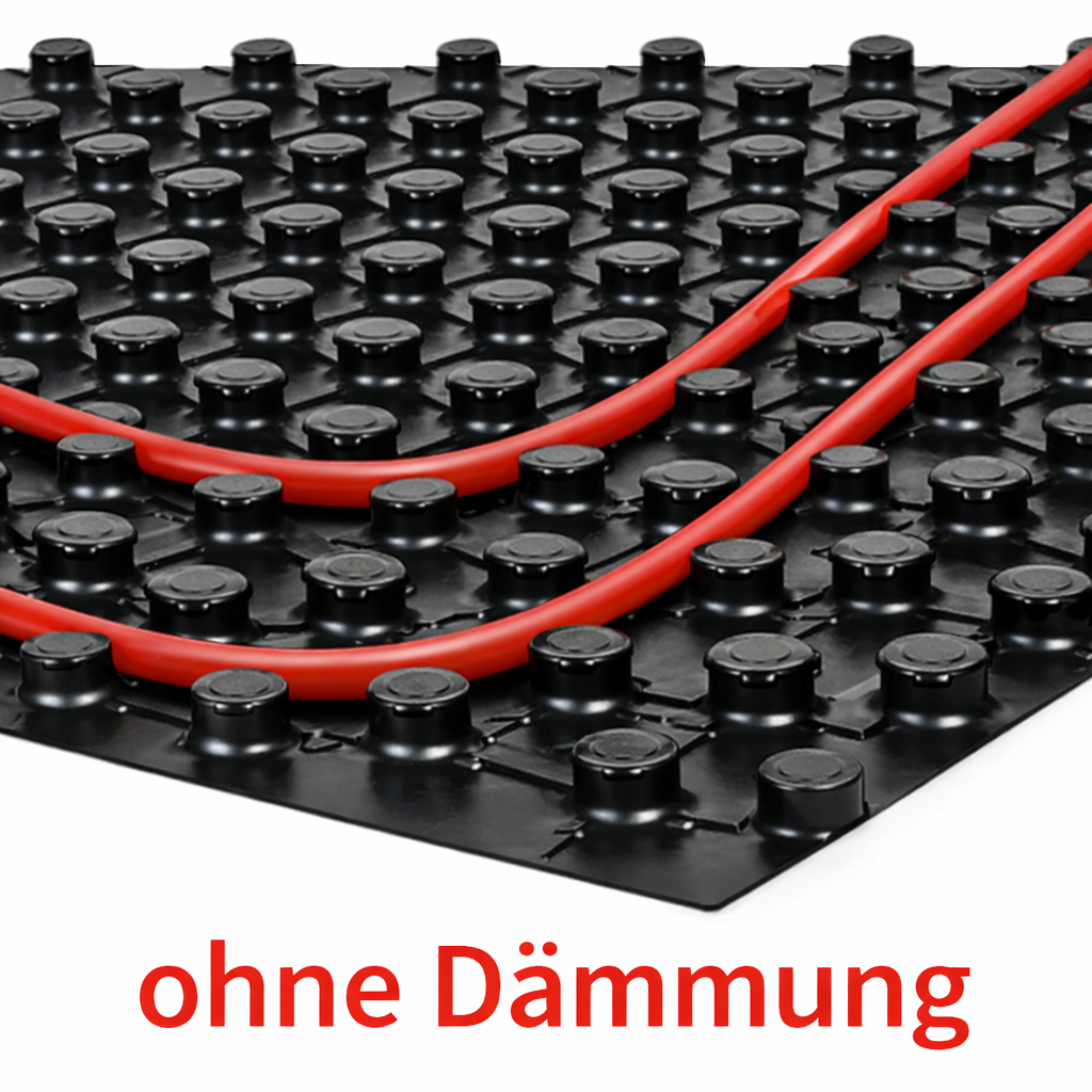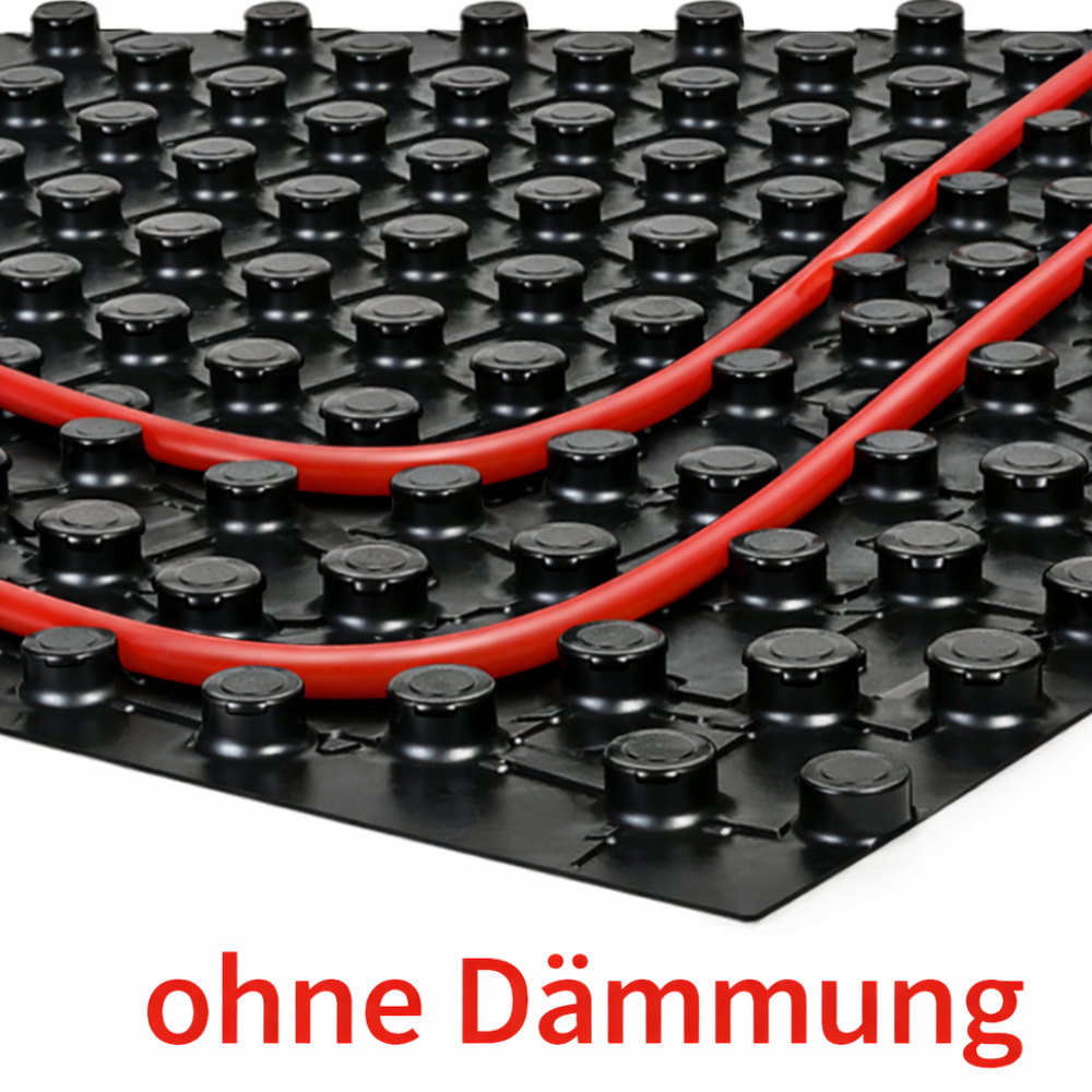 Die Platte besteht aus verstarkter PS-Folie mit trittfest ausgeformten Noppen. Die zweiseitige Überlappung ermöglicht eine estrichdichte Verbindung (Druckknopfverbindung).