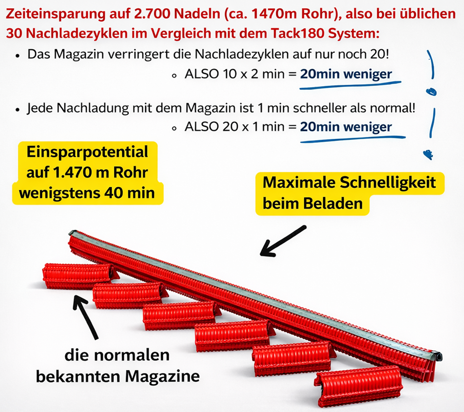 Durch unser neues TACK180 System fasst der Tacker wesentlich mehr Nadeln gegenüber allen anderen Geräten am Markt.