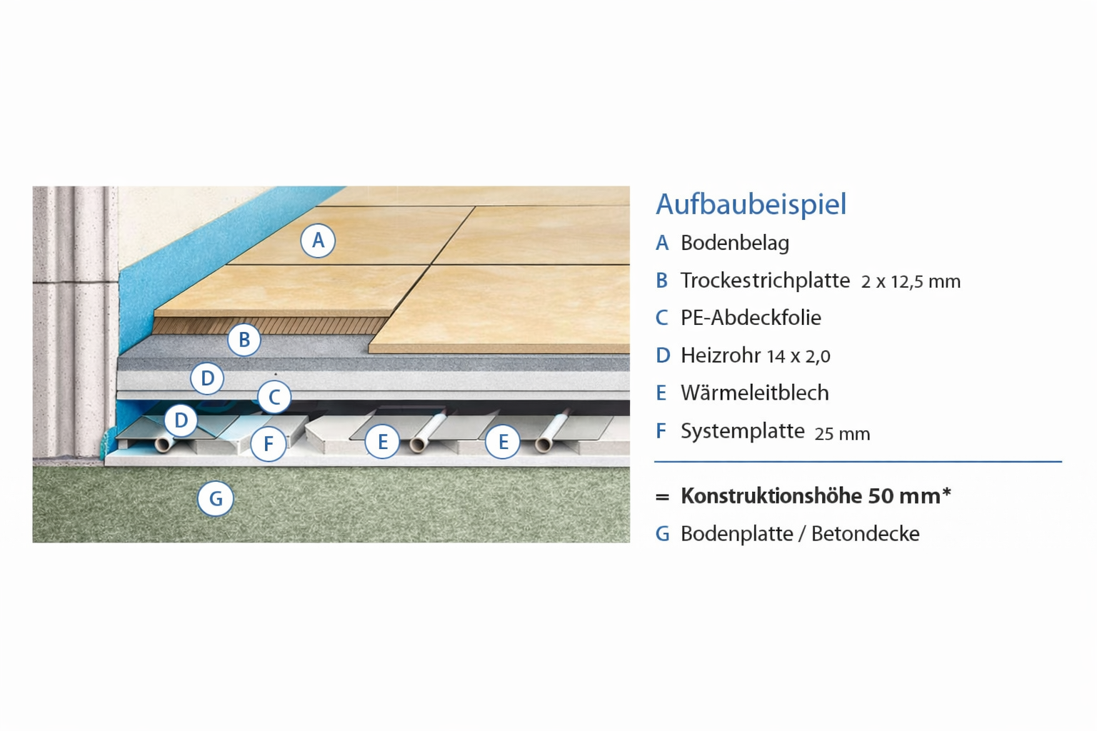 Das flexible Trockenbausystem überzeugt durch geringe Aufbauhöhe, minimalem Gewicht sowie optimaler Wärmeverteilung. Einfache Plattenverbindung durch einfügende Steckverbindungen („Puzzle-Verbindung"). Maße (Nutzfläche): 1000 mm x 750 mm. Dadurch halten die Platten untereinander besser und sind einfacher zu verlegen.