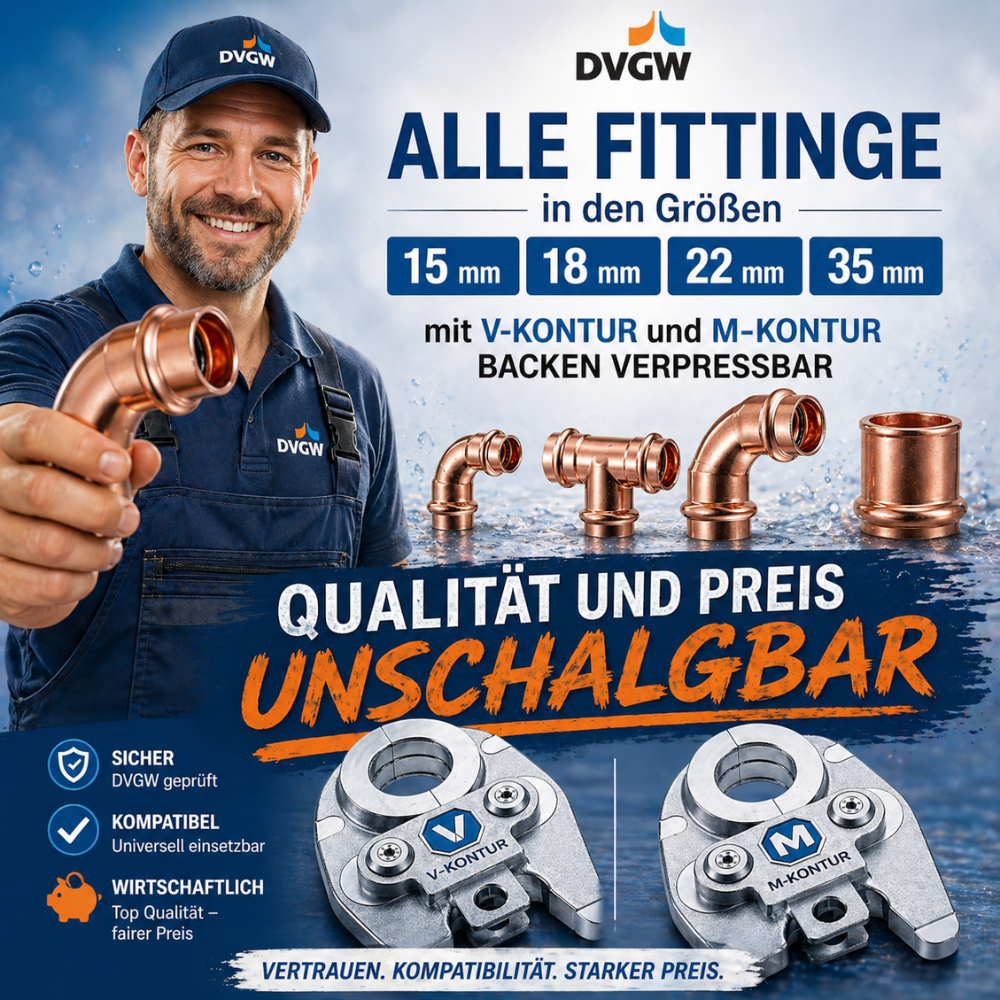Kupfer Press Fittings aus bewährtem Kupfer und Rotguss wurden für alle Bereiche der Haustechnik entwickelt und sind geeignet für Trinkwasser, Heizung, Industrie u.v.m.