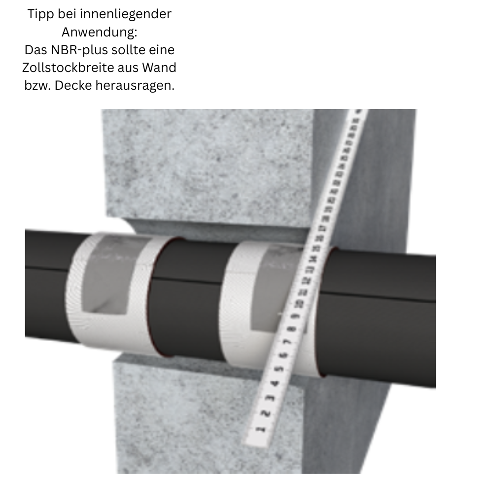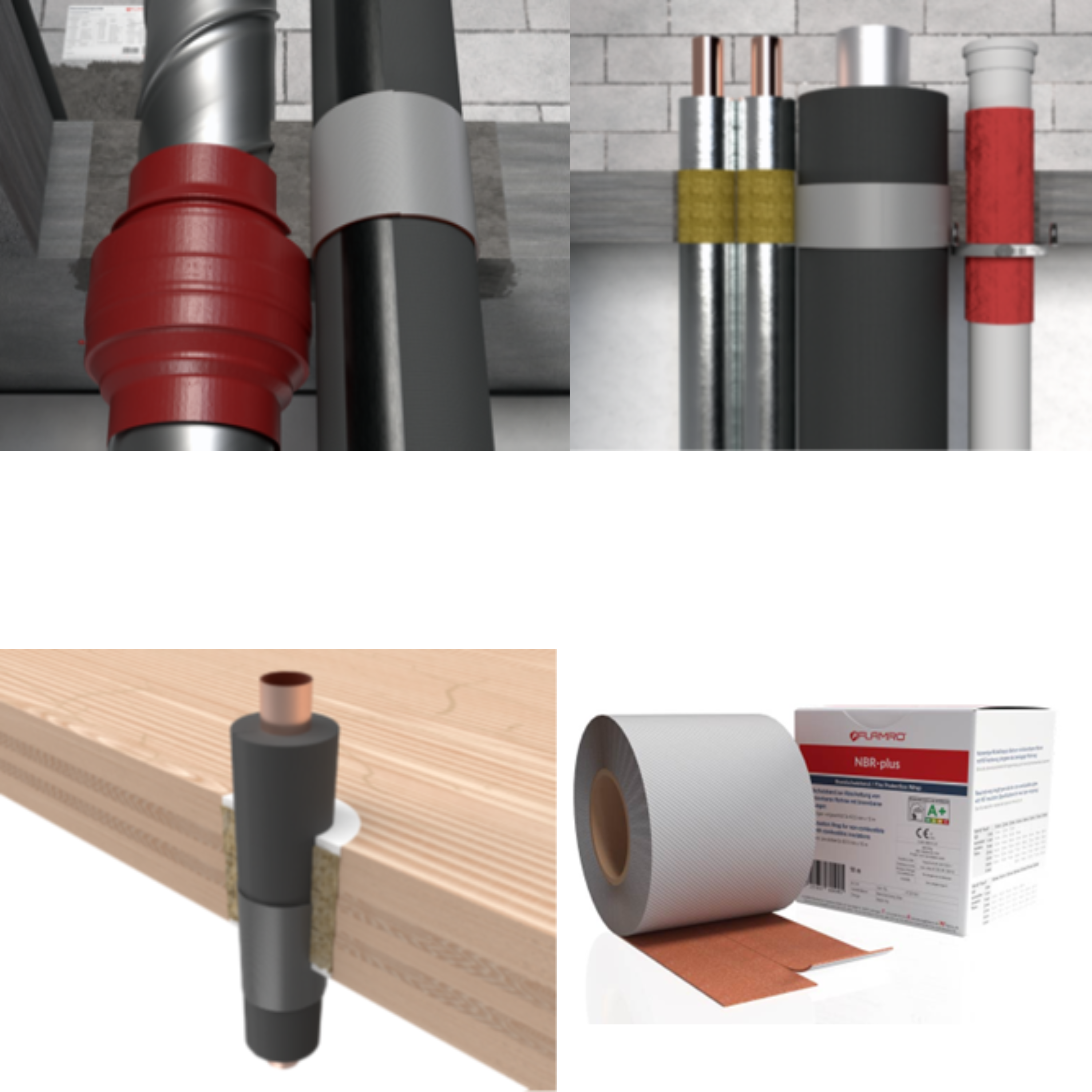 Das Brandschutzband NBR-plus schottet nichtbrennbare Rohre mit Kautschuk und Glaswolldämmung Isolierung und Klimasplit-Leitungen mit einer Feuerwiderstandsklasse R 90 bzw. R 120 nach DIN 4102-11 ab. Der Materialverbrauch von NBR-plus ist äußerst gering. Dank der Schnitthilfe in der Mitte kann die Bandage für den Einbau in der Wand einfach geteilt werden.