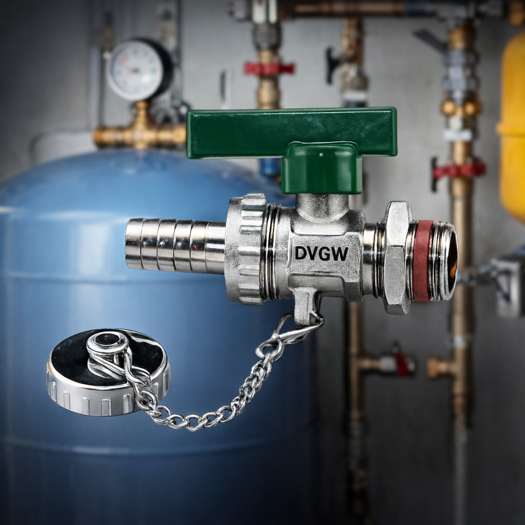 - incl. Schlauchverschraubung, Kette und Kappe