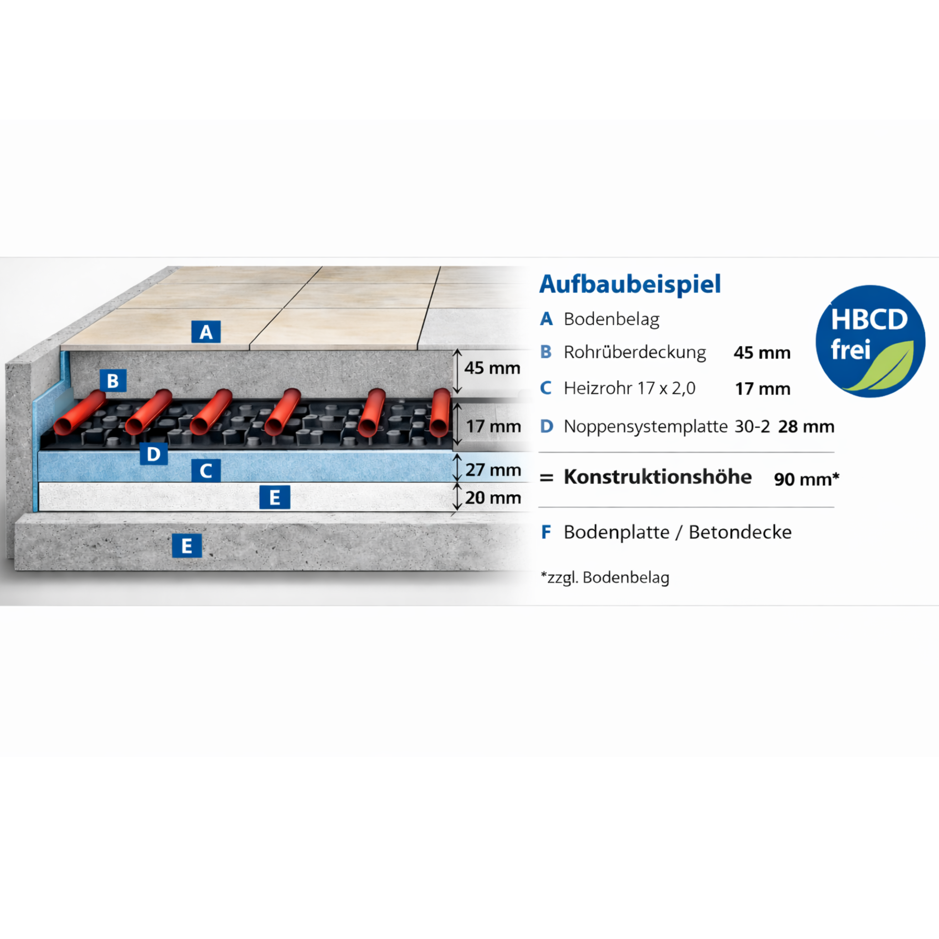 Die BABO-Therm Systemplatte ist mit einer Wärme-Trittschalldämmung versehen und entspricht der Anwendung gemäß DIN EN 13163 (Innendämmung auf Decken oder Bodenplatten und unter Estrichen nach DIN 4108-10). Die Dämmung besteht aus einer EPS-Schaumplatte mit Foliendeckschicht gemäß DIN18560. Einfache Plattenverbindung durch zweiseitigen Folienüberstand mit Stülpnoppen (estrichdichtes Druckknopfprinzip). Farbe schwarz, Noppenhöhe 17 mm, Plattengröße inkl. Überlappung: 1.450 x 850 mm. Nutzfläche: 1.400 x 800 mm.