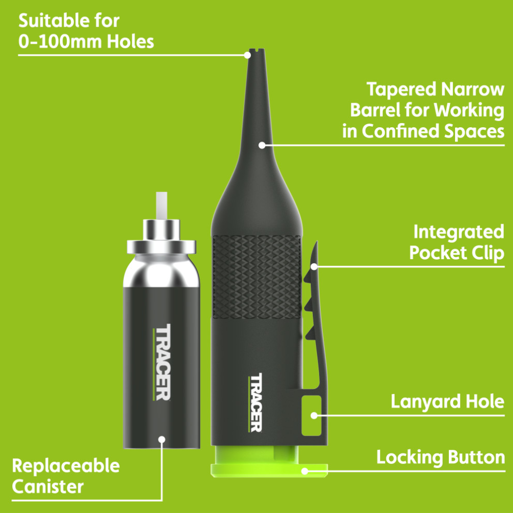 Das TRACER Trueshot Kreidemarker-Set ist ein innovatives Werkzeug zum Markieren tiefer Löcher, das präzise Kreidemarkierungen von 0 mm bis 100 mm Tiefe ermöglicht. Dank der einfachen Sprühfunktion erzeugt der Trueshot Kreidemarker auf jeder Oberfläche eine hochpräzise Kreuzmarkierung. Ausgestattet mit einem austauschbaren Kreidebehälter für bis zu 350 Schuss, einer 3-stufigen Verriegelungsfunktion (Sprühen, Verriegeln, Austauschen), einem robusten ABS-Gehäuse, einem konischen Schaft, einem Taschenclip und einer Öse für ein Lanyard.