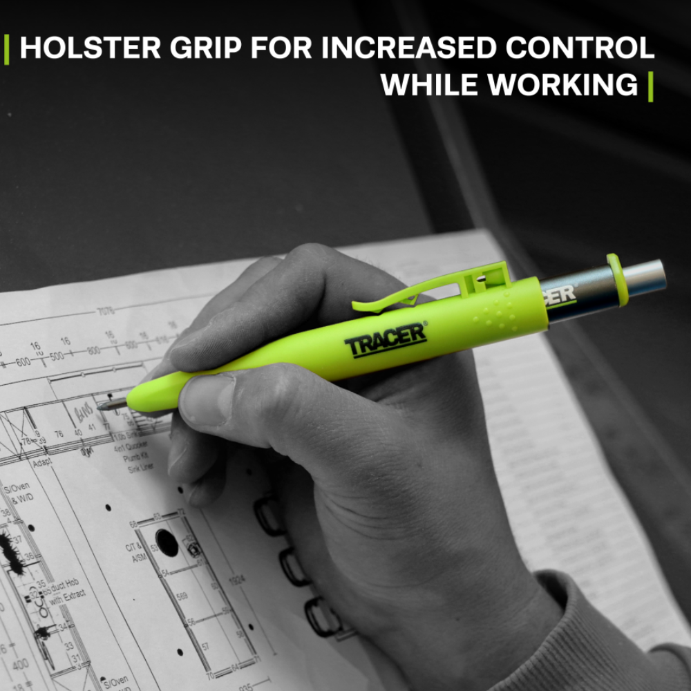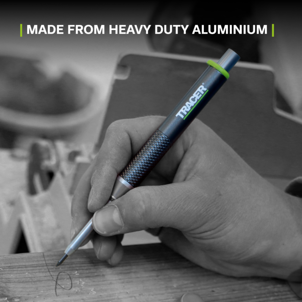 Das TRACER Pro Series Tiefloch-Markierstift-Set ist das ultimative Werkzeug für Profis. Der Stift mit seinem robusten Aluminiumgehäuse ermöglicht Markieren bis zu 145 mm tief in 6-mm-Löchern und enthält sechs Graphitminen in einem bruchsicheren Spender. Ein Holster mit integriertem Anspitzer sorgt dafür, dass alles griffbereit ist, während das rutschfeste Design und der ergonomische Griff präzises Arbeiten ermöglichen.