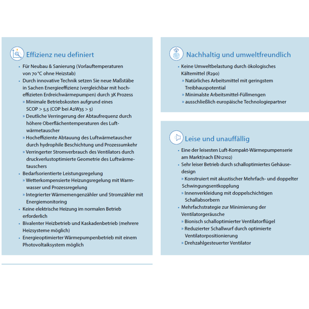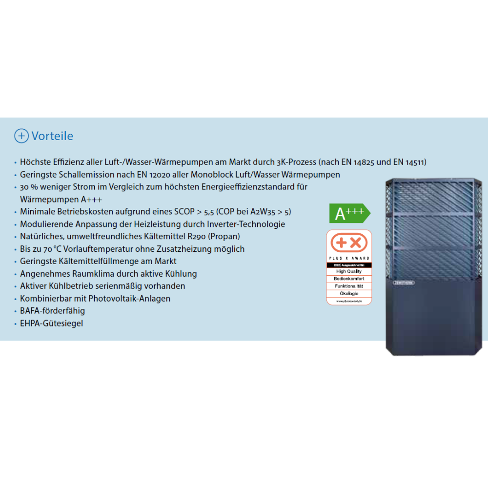 - Höchste Effizienz aller Luft-/Wasser-Wärmepumpen am Markt durch 3K-Prozess (nach EN 14825 und EN 14511)
